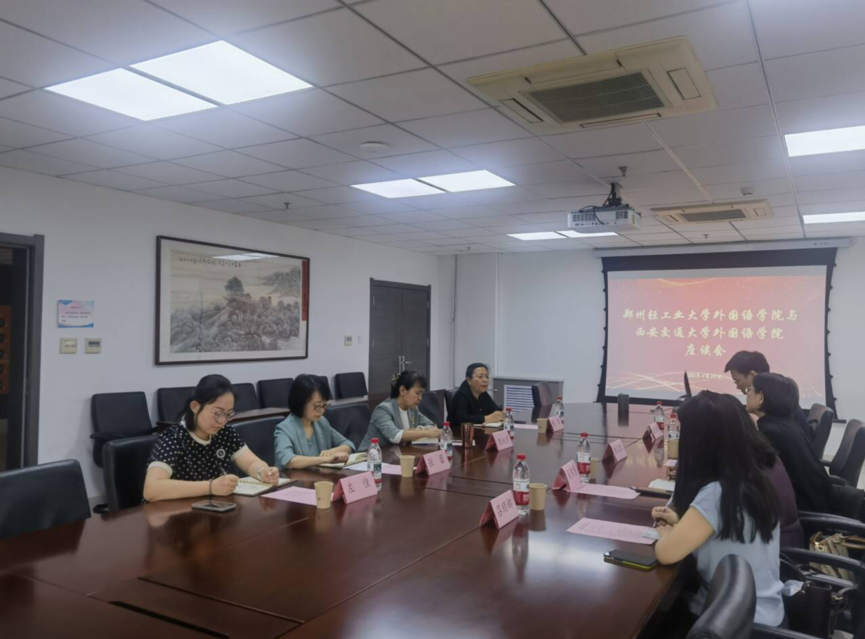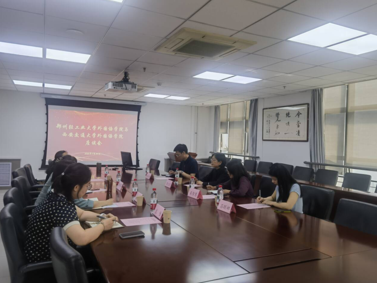 4月24日上午,郑州轻工业大学外国语学院院长陈文凯,大学英语教学部主任吴智慧,英语系主任赵永刚,大学英语教学部教师吕颐娜一行来访西安交大外国语学院,双方在外文楼B912会议室座谈交流。西安交大外国语学院院长陈向京,大学英语教学中心主任黄奕,英语系副主任张蕾,教务主管左佳参加座谈。
