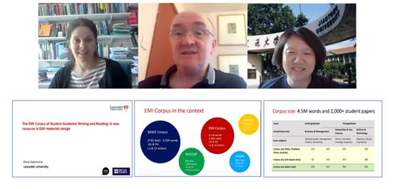 论坛沿用高端访谈、专题讲座和问答互动相结合的形式。访谈环节,专家们就语料库研究方法及如何将语料库应用于EAP教材设计等话题进行了深入交流。专题讲座环节,Gablasova博士系统介绍了EMI语料库的建设过程、遇到的问题积极决方案,并通过数据分析展示了中、意、泰、英四国EMI学生写作和阅读的语言需求,还阐述了语料库数据在设计EAP教学材料中的应用,通过语料库提升EAP材料在EMI环境中的有效性、相关性和真实性等问题,为相关教学实践提供了重要参考。互动环节中,Gablasova博士和McEnery院士就语料库的共享使用、语料库选择标准、AI工具辅助学术写作等问题进行了耐心解答。