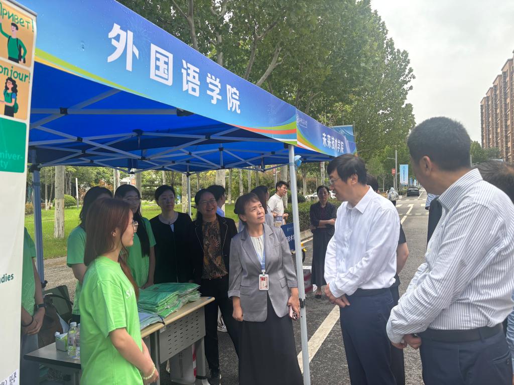 张立群校长、洪军副校长、王欢副书记一行来到学院迎新点位亲切慰问一线工作人员和志愿者,院长陈向京汇报了迎新工作筹备情况、新生数据信息和学院人才培养情况。张立群校长对学院专业发展和人才培养成效给予肯定,提出要深耕语言研究文化土壤,培养更多高素质的语言研究人才。