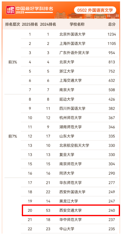 10月15日,高等教育专业评价机构软科正式发布“2025软科中国最好学科排名”。该榜单涵盖98个一级学科和5个专业学位类别,共有517所高校的5344个学科点上榜。在本次排名中,外国语言文学学科共有240所高校参评。西安交通大学该学科依托扎实的学科根基、突出的科研创新能力、良好的社会服务与学科声誉,排名从2024年的第53名跃升至2025年的第20名,首次进入前9%,展现出强劲的上升态势与综合实力。